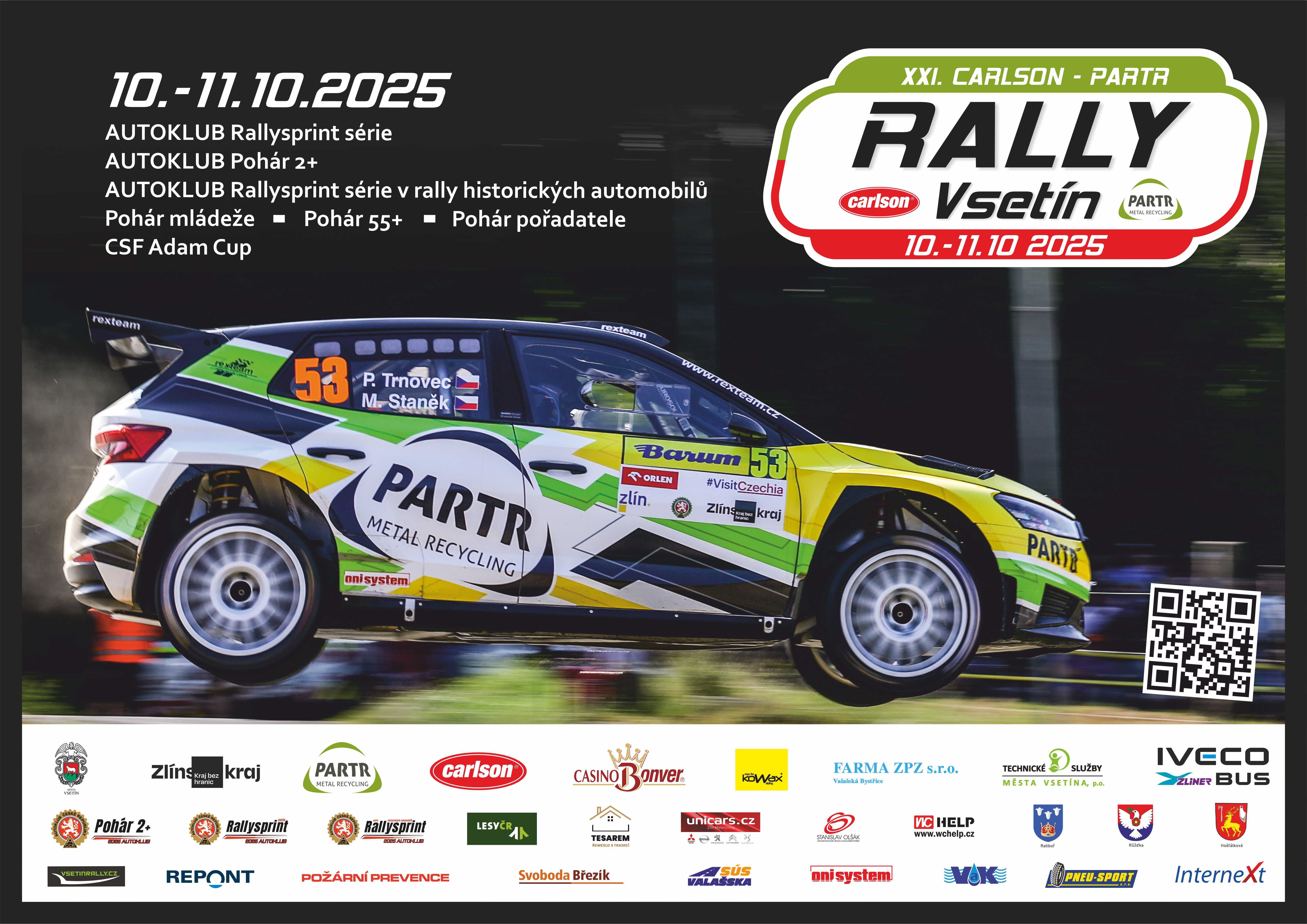 XXI. Carlson - PARTR Rally Vsetín, pořádaná Autoklubem Vsetín – město v AČR, se uskuteční ve dnech 10. – 11. října 2025.